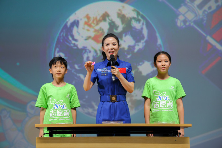 中国首位出舱女航天员王亚平与青少年互动,分享太空故事。图/中国科技馆